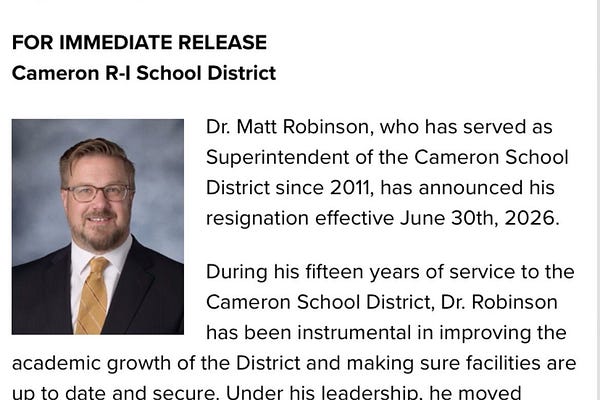 Matt Robinson's resignation as superintendent comes at a questionable time. Cameron School District will be better off without him, but they shouldn't…