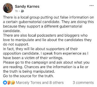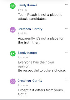 Last evening, Mrs. Karnes saw fit to delete my Team Reach post of the article regarding alleged lawfare on the part of the SOS's Office. It was posted below a pro-Ashcroft flyer Karnes had posted. Is the cardinal rule in the primary season that candidates supported by the Establishment shall have no open opposition? Are the issues addressed in the article not to be given an airing because we have to be respectful of others' choices? Karnes has apparently posted on Facebook about the situation, although she is careful not to name names. Why? Name names. Let us dialog and see who is lying and who is telling the truth.
