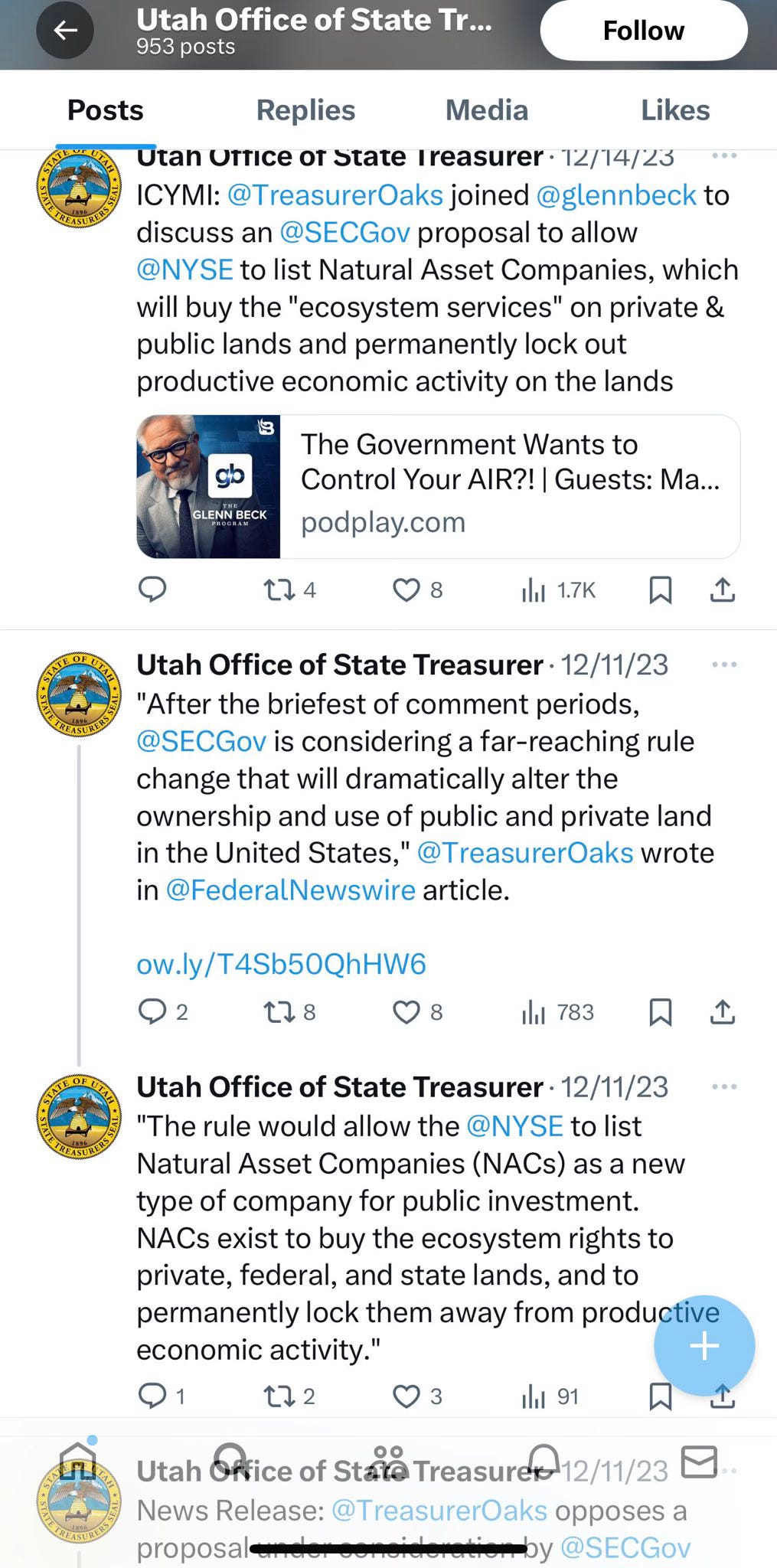 One State Treasurer is standing against this collusion of tyranny between the money-grubbing rich and the incompetent government. According to Marlo Oaks, the Utah State Treasurer, “the rule would allow the @NYSE to list Natural Asset Companies (NACS) as a new type of company for public investment. NACs exist to buy the ecosystem rights to private, federal, and state lands, and to permanently lock them away from productive economic activity.”16 They can lock them away permanently.