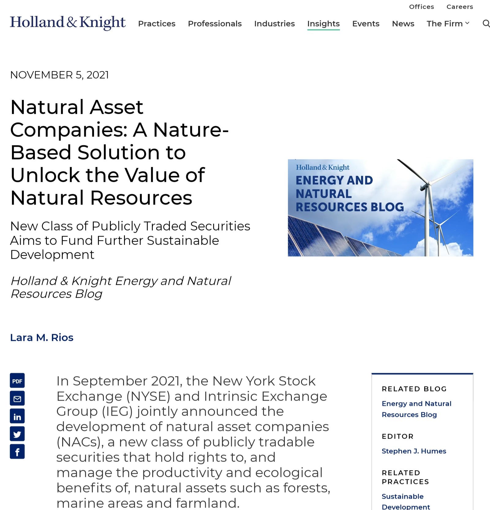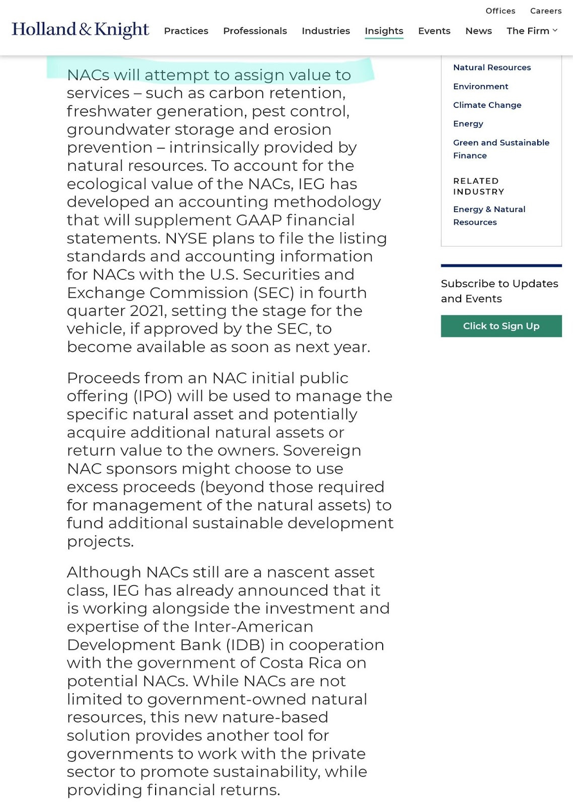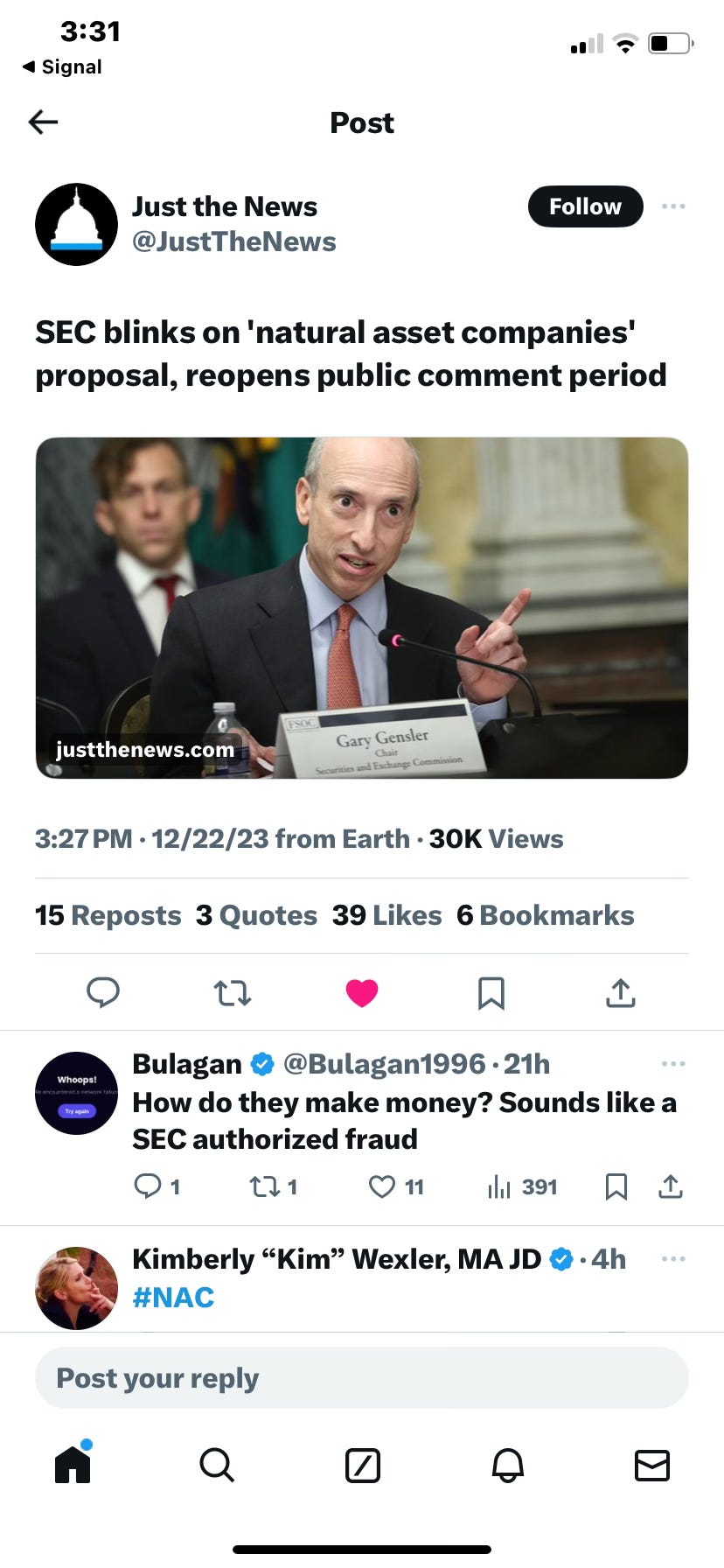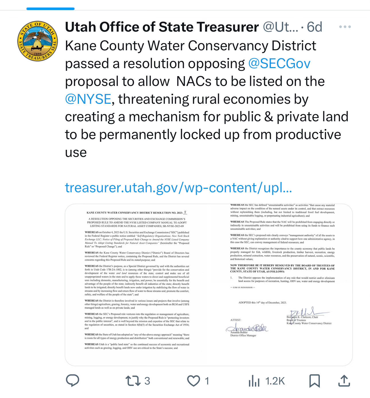 SEC blinks on 'natural asset companies' proposal, reopens public comment period, Ben Whedon. https://justthenews.com/government/federal-agencies/sec-blinks-natural-asset-companies-proposal-reopens-public-comment?utm_source=mux&utm_medium=social&utm_campaign=tw Accessed 12/23/23.