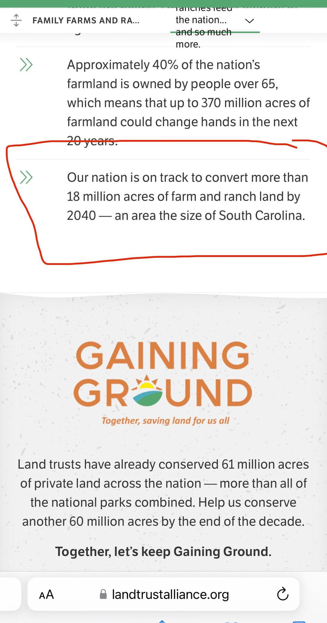 We may think this is a New York problem, but it’s our problem in Missouri and America. It’s a problem for nations in Africa and Asia in the near future and a serious problem in our nation when we start to run out of land which can be used to feed our own population. “Our nation is on track to convert more than 18 million acres of farm and ranch land by 2040–an area the size of South Carolina.”10 Further, they are excited that, “40% of the nation’s farmland is owned by people over 65, which means that up to 370 million acres of farmland could change hands in the next 20 years.”11 Why is this a problem for us? Or for the world?