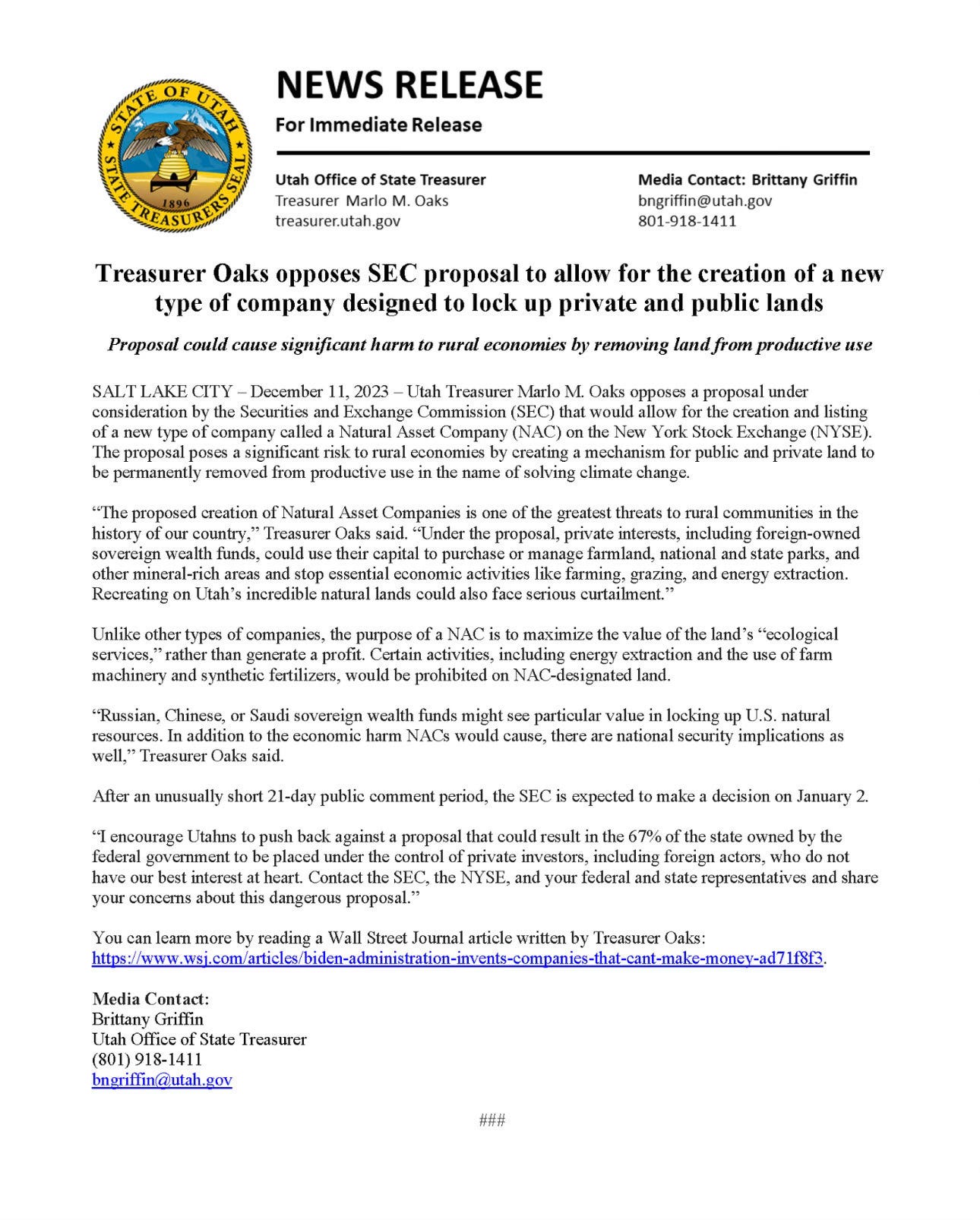 Utah State Treasurer X Account, Marlo Oaks. https://twitter.com/UtahTreasurer/status/1738307693889175979/photo/1 Accessed on 12/21/23 Bold-Face mine.