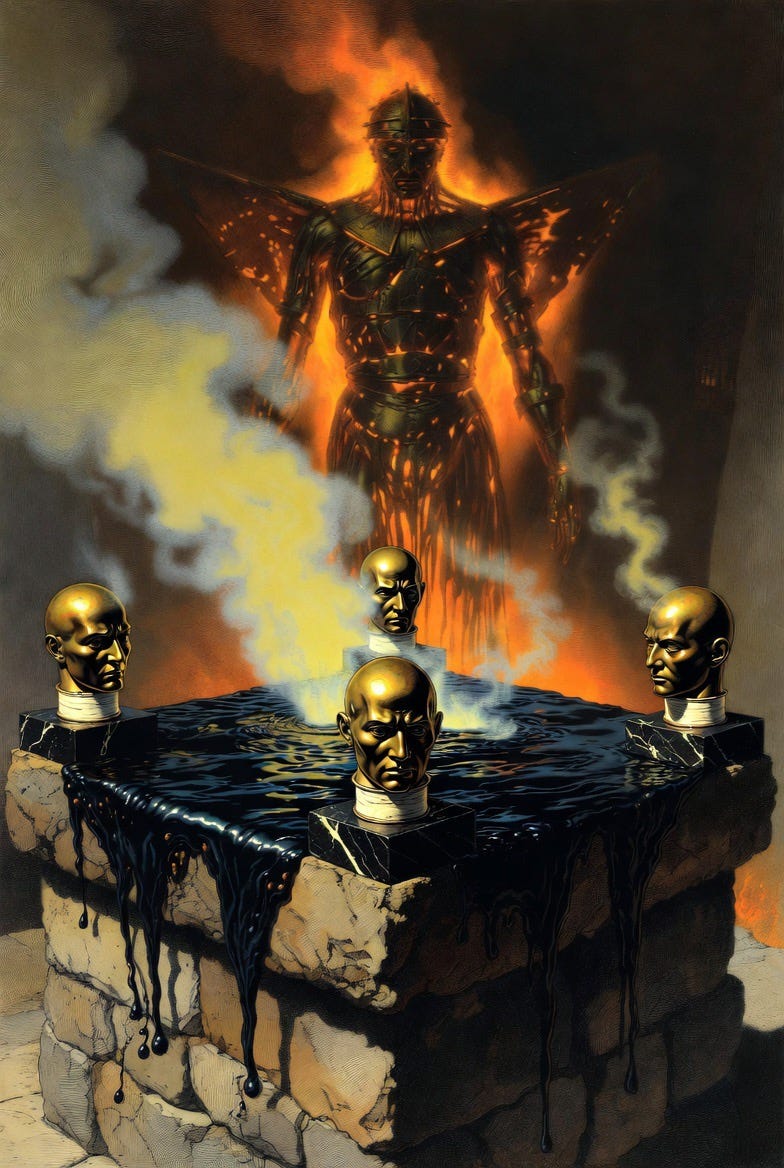 The principality men had once called Moloch—before they forgot his name, before they learned softer words—extended one bronze hand over the black stained altar. The surface was an oil slick, tar bubbled, sulphuric gases permeated the air around the altar.